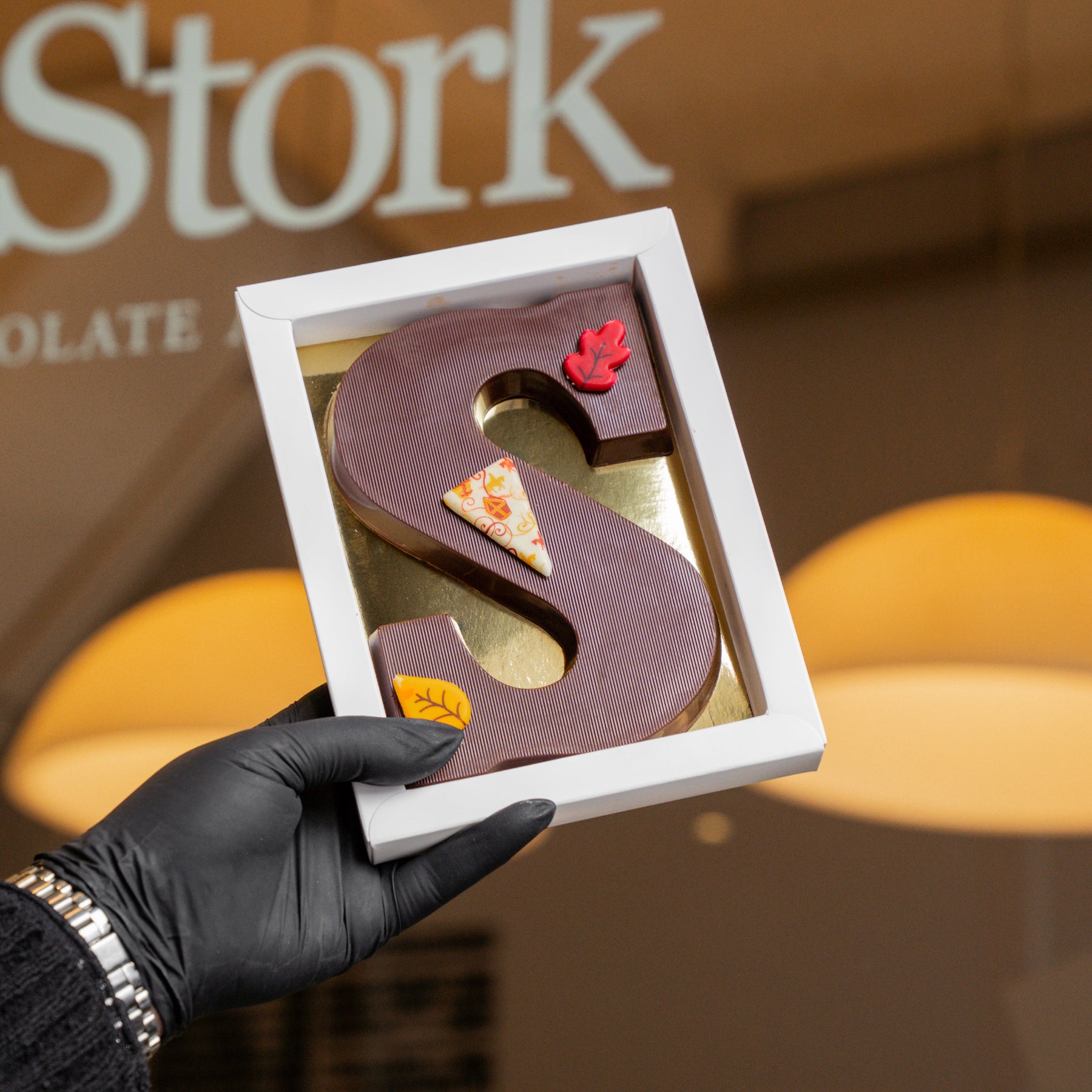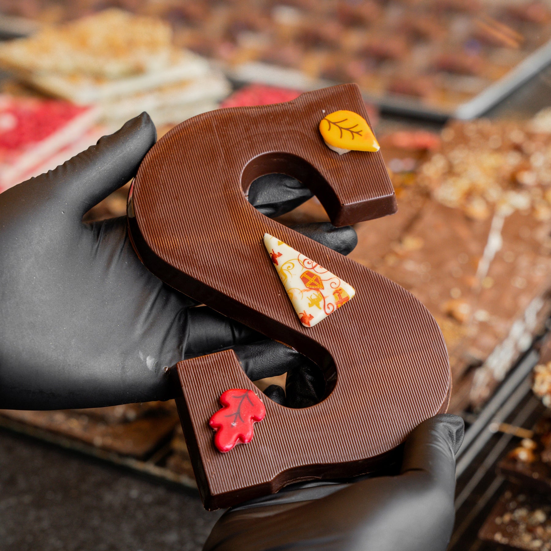 Ambachtelijk gegoten pure chocoladeletter S met zachte marsepein vulling.