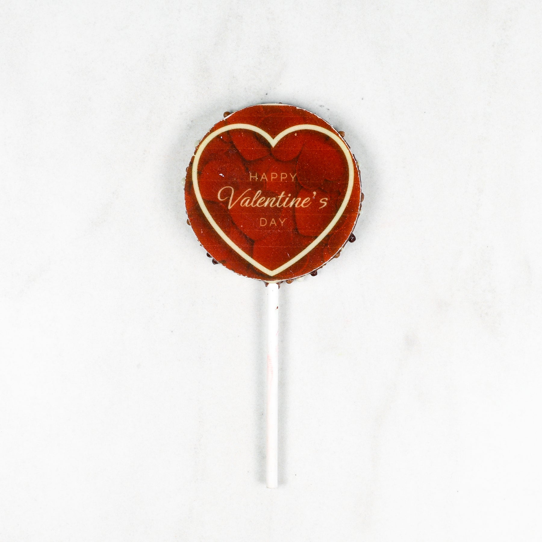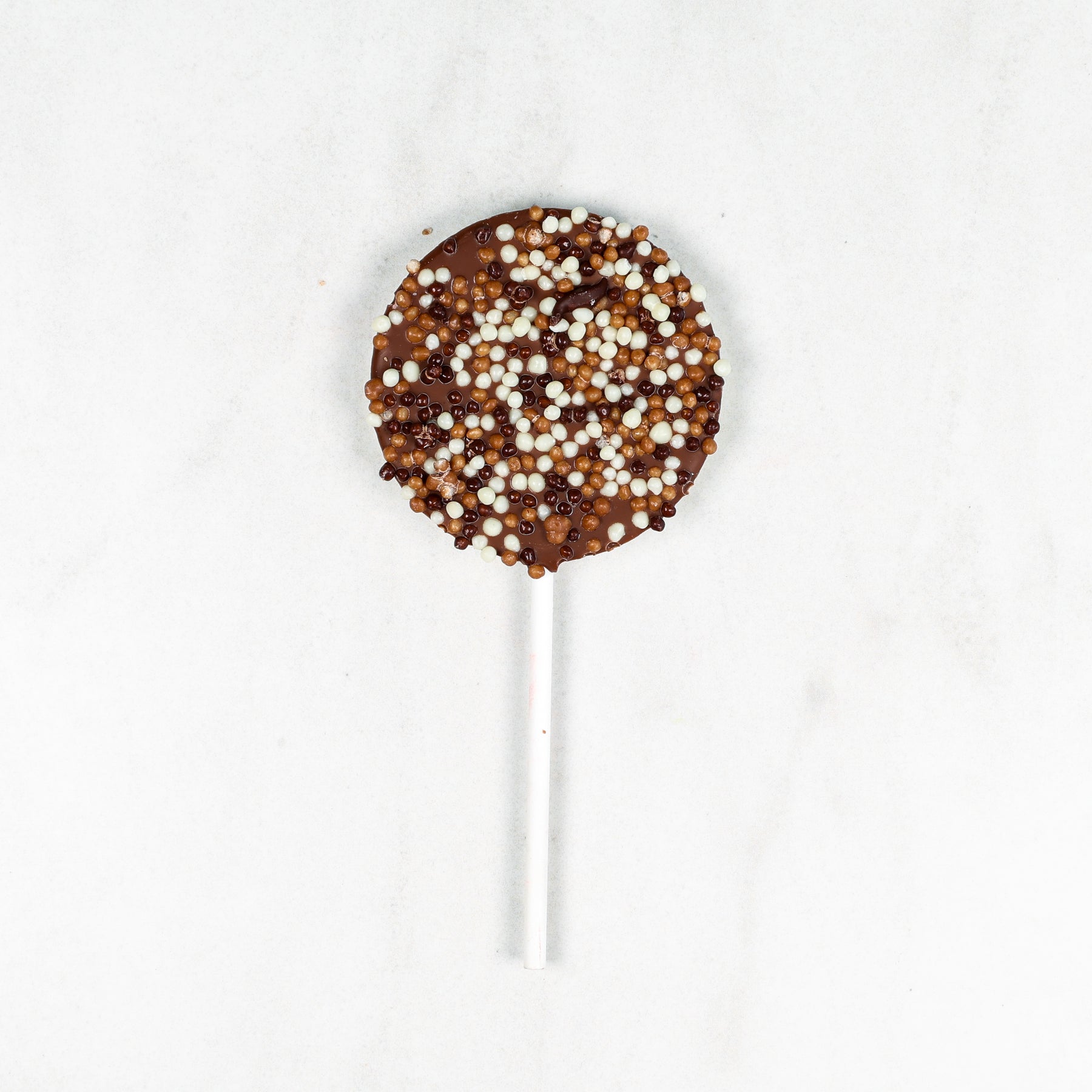 Chocolade lolly van melk en witte chocolade met crispy pearls.